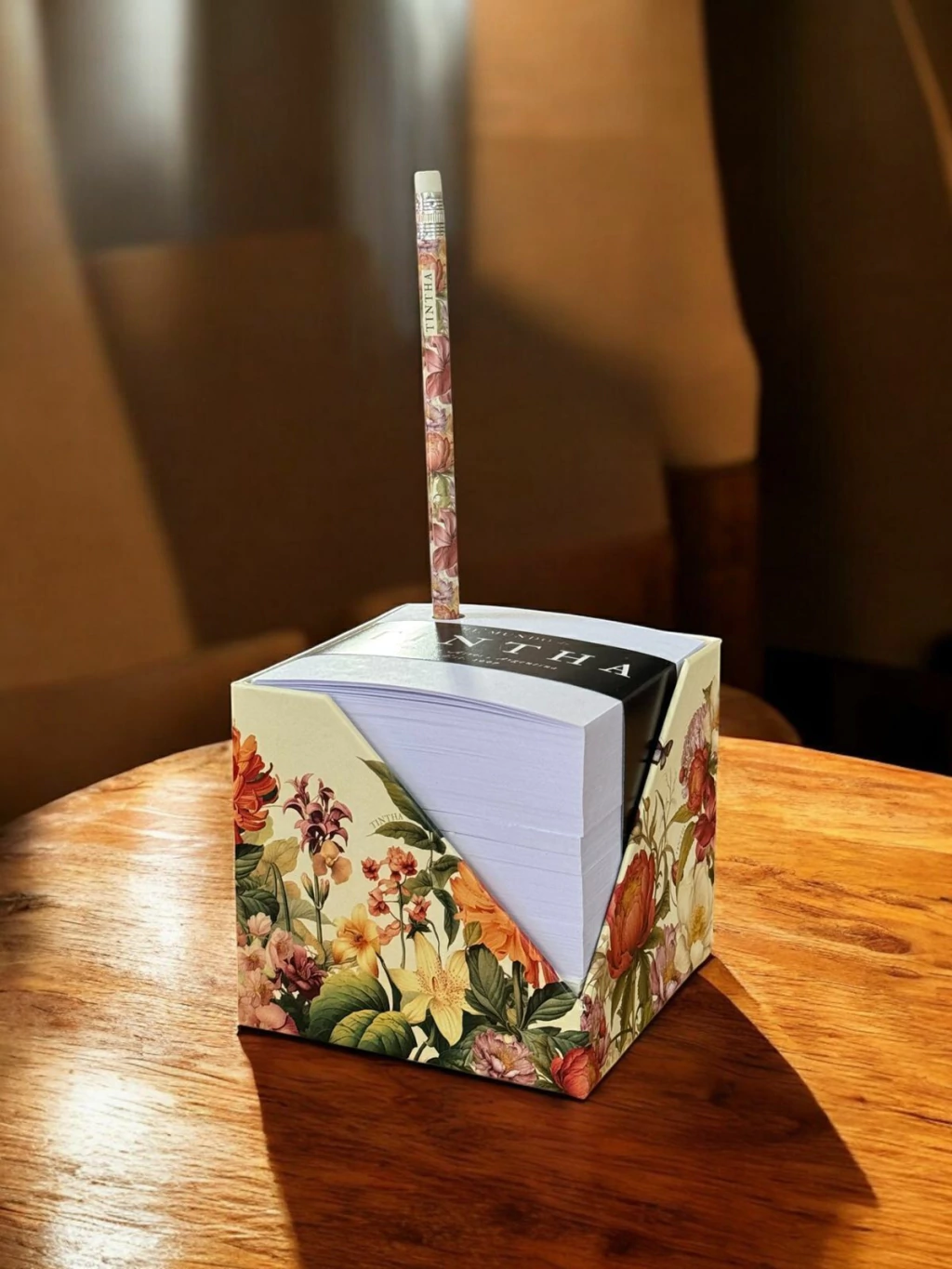 Presentación: Formato cúbico de 10x10x10 cm con un diseño delicado que aportará un toque de elegancia a tu espacio de trabajo.