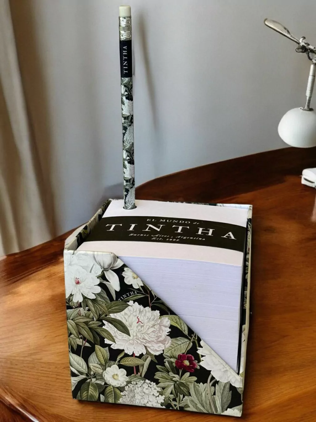 Descripción: Taco de escritorio con hojas blancas y lisas, adornado con un colorido diseño de flores blancas. Incluye un lápiz grafito que complementa perfectamente su estilo.