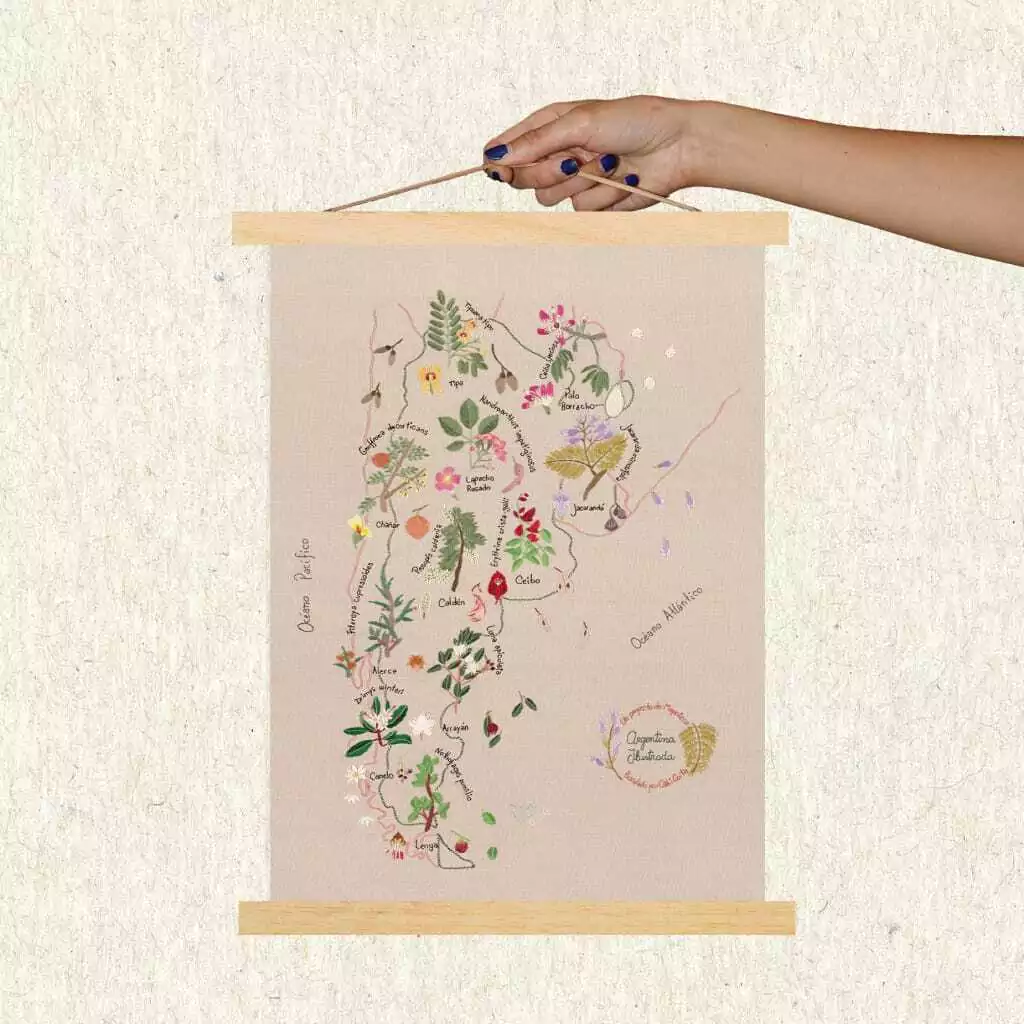 Si un amante de la flora nativa necesitara un mapa, sin duda sería este. Un mapa íntegramente bordado de árboles nativos de Argentina. A través de miles de puntadas descubrirás las especies endémicas de nuestro país. El ceibo, el chañar, el lapacho rosado, el arrayán y el caldén, entre muchos otros. Llevá tu pasión por la botánica a tus paredes y empezá a viajar desde casa con este mapa de árboles nativos bordado de argentina.